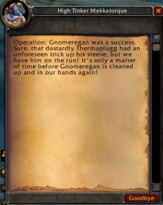 Unexpectedly, I found myself feeling nostalgic for the old Gnomeregan. It’s great that the Gnomes have made such progress on taking back their city, but I miss the feel of the old, toxic, abandoned, underground city that it used to be. Something about it is missing, now. That being said, I did stick around long enough to take out Mekgineer Thermaplugg one more time!
